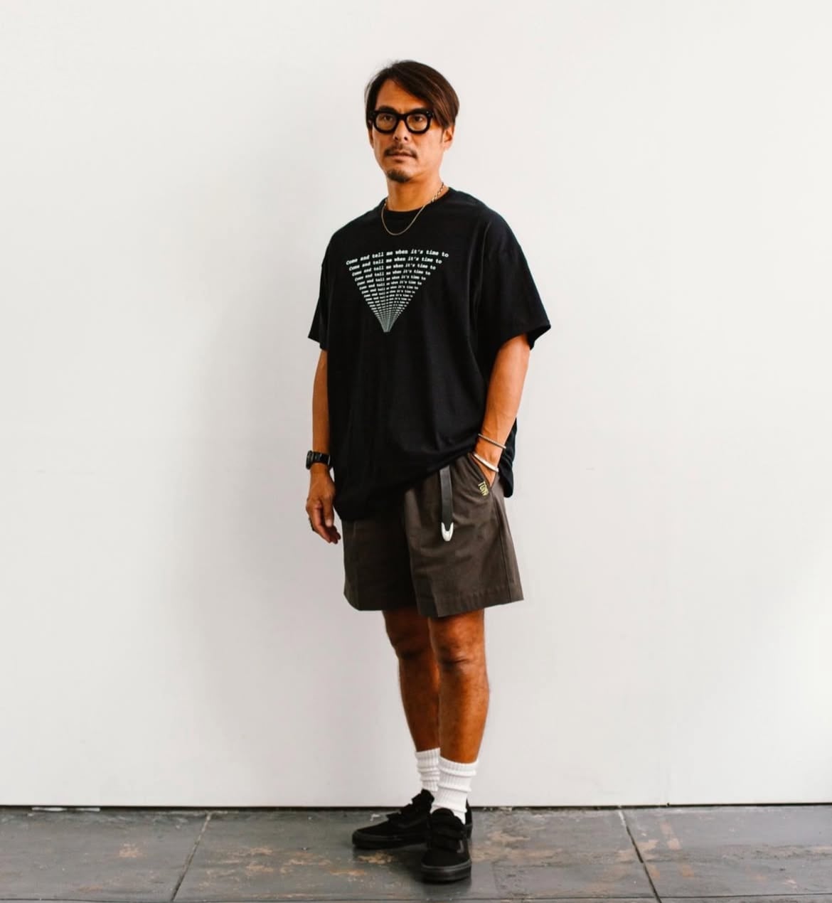 25SP-018 Tony Taizsun / FAN SHAPE TEE 上代¥6,930 カラー BLK SIZE :L、XL サンプルサイズXL Lサイズ=着丈:71.5㎝ 身幅:56㎝ 肩幅:50㎝ 袖丈:20㎝ XLサイズ=着丈:74㎝ 身幅:59㎝ 肩幅:52㎝ 袖丈:21㎝ 定番のプリントTEE。 "Come and tell me when it's time to" 好きな曲のワンフレーズです。 The world I love The trains I hop To be part of The wave, can't stop "Come and tell me when it's time to" 愛する世界で飛び乗る列車が波の一部になる、止められない "その時が来たら教えてよ"