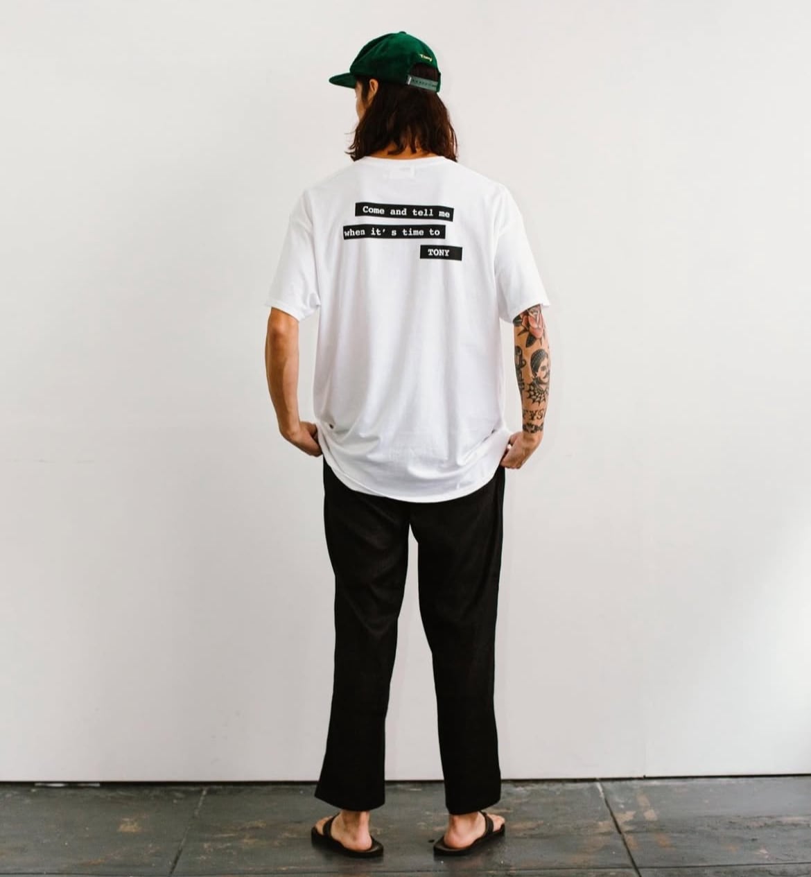 25SP-018 Tony Taizsun / FAN SHAPE TEE 上代¥6,930 カラー WHT SIZE :L、XL サンプルサイズXL Lサイズ=着丈:71.5㎝ 身幅:56㎝ 肩幅:50㎝ 袖丈:20㎝ XLサイズ=着丈:74㎝ 身幅:59㎝ 肩幅:52㎝ 袖丈:21㎝ 定番のプリントTEE。 "Come and tell me when it's time to" 好きな曲のワンフレーズです。 The world I love The trains I hop To be part of The wave, can't stop "Come and tell me when it's time to" 愛する世界で飛び乗る列車が波の一部になる、止められない "その時が来たら教えてよ"